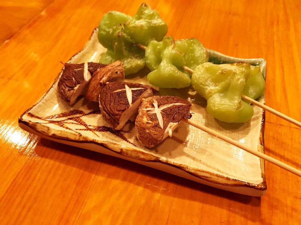 じっくり焼くことで香りと柔らかい食感が楽しめるしいたけ。ベルピーマンは、普通のものよりも苦味が少なく、爽やかな味わい。鶏串や肉の合間にいかがでしょうか。