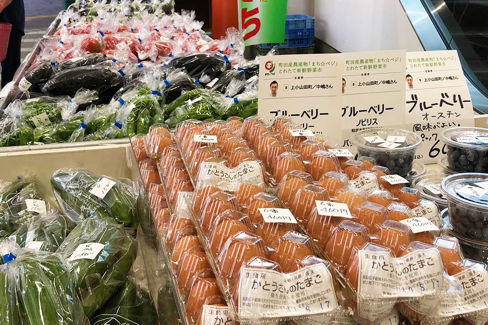 JR横浜線町田駅の改札から歩いてすぐ!東急ツインズイーストの1階正面口にて、『まち☆ベジ』東急直売会が開催されました。年に1~2回開催されているこの直売会。駅近という事もあり、東急へお買い物に来た方や、たまたま駅の近くを通りかかった方など、普段『まち☆ベジ』を買う機会がなさそうな方も多く見受けられました。ちなみにこの日のラインナップは、トマト、ピーマン、キュウリ、ナスなどの朝採れ夏野菜と産みたて卵、そして普段あまり直売会には並ぶことがないブルーベリーでした。エレベーター降り口付近に並んでいた数種類のブルーベリー、その中には先日取材した時にいただいた大粒の品種がありました。街中のスーパーでは見かけないそのサイズに、思わず足を止め、多くのお客様がビックリしていましたよ。