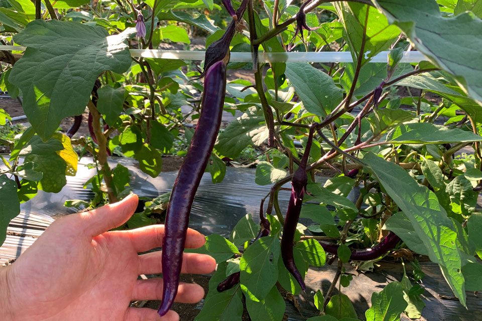 そちらに実っている長いナスは昨年、西園の取材に行った時に拝見しました。たしか、ヘビナスっていうんですよね?(Twitterは⇒