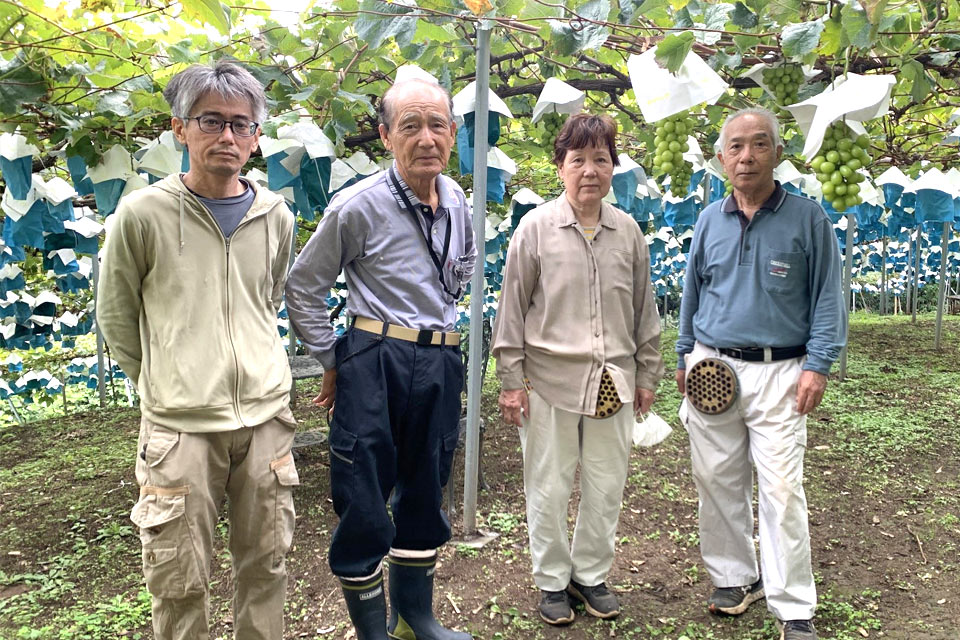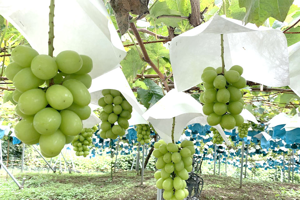 路地栽培をしているため、生育が安定するハウス栽培よりも苦労が多いそうです。手作業で間引いて房の形を作ったり、どんどん伸びる蔓や葉っぱを処理したりするため足腰や肩にも負担が掛かります。その分自然の日を浴びてとても美味しいシャインマスカットが実ります。一つ一つを丁寧に育てていらっしゃることが伺えますね。