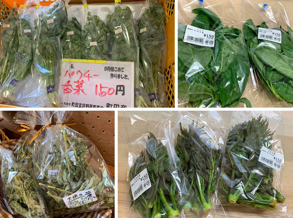 パクチーにバジルと言った香草類も時々見かけます。新鮮なパクチーは苦手な方でも食べやすいかもしれません。バジルはその香りの良さに驚きます。「小野路宿里山交流館」で加工して販売している大根の葉を乾燥させたものは、汁物などにも使えますね。春には山菜も出回ります。