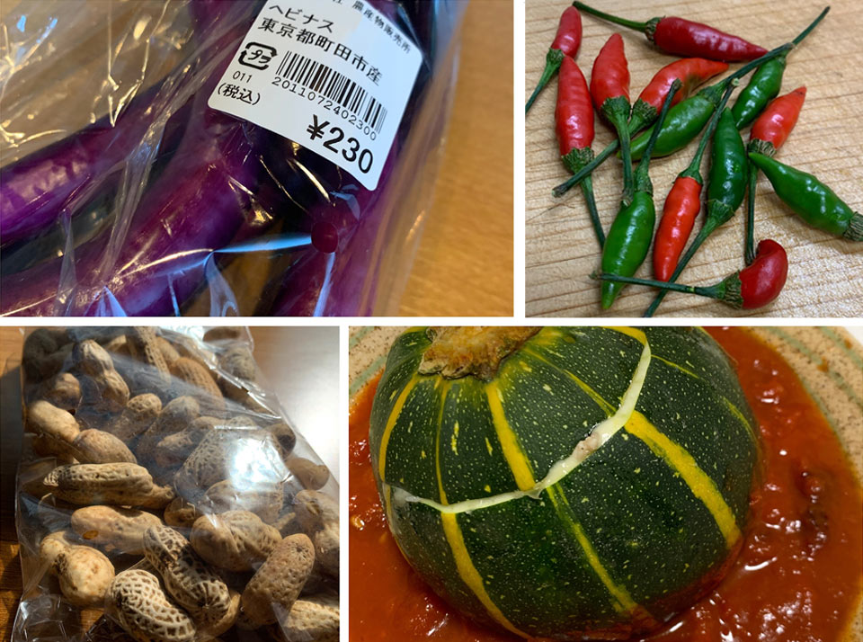 長くて細いヘビナスに、島とうがらし。左下は大きな生落花生です。茹でるのに時間はかかりましたが最高に美味しいです。右下は丸いズッキーニ。形を生かした料理を考えるのも楽しいです。