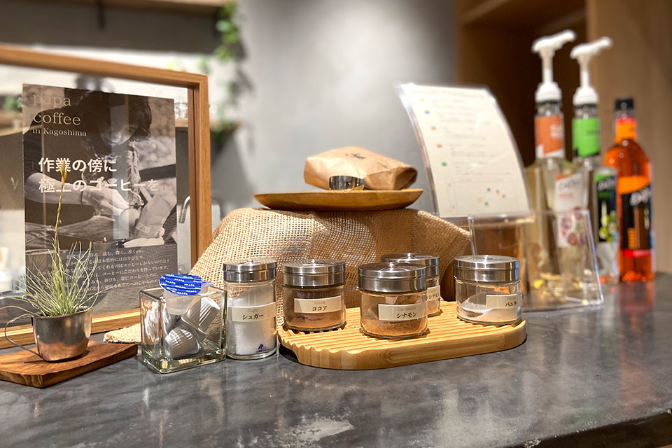 こちらがカフェコーナーです。おしゃれですね。ドリンクには以前からこだわっていて、町田出身の焙煎士が手がけるコーヒーの種類が増えました。フレーバーコーヒーも楽しめます。お茶は15種類!アイスドリンクも充実しました。