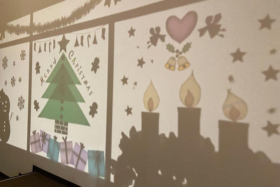 三徳右側の階段を登ったところには大きなクリスマスツリーが。写真に撮ったり、SNSにアップしたりしてください!廊下には楽しい影絵も!見るだけで楽しくなりますね。