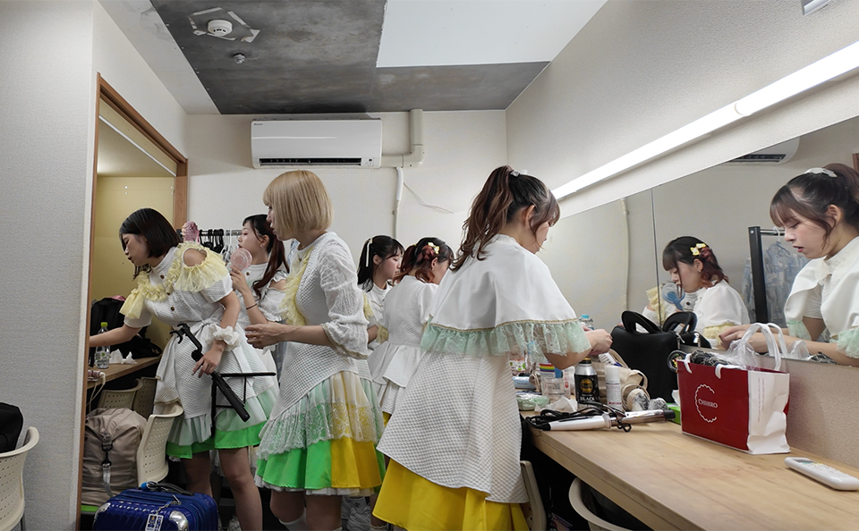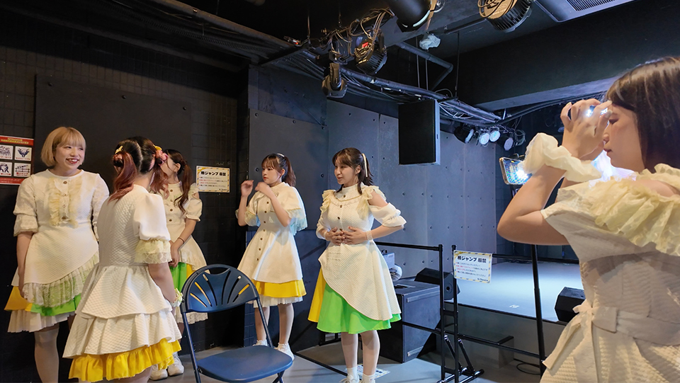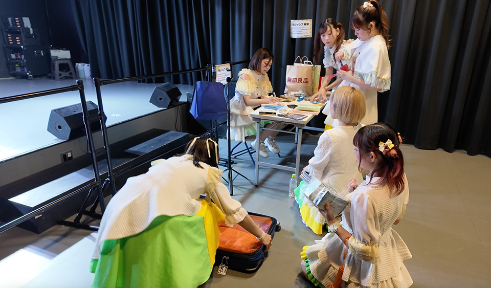 楽屋に戻ってくると、物販に出るための準備です。汗もかいているので水分補給をして整えたら荷物を準備して物販会場の客席に向かいます。