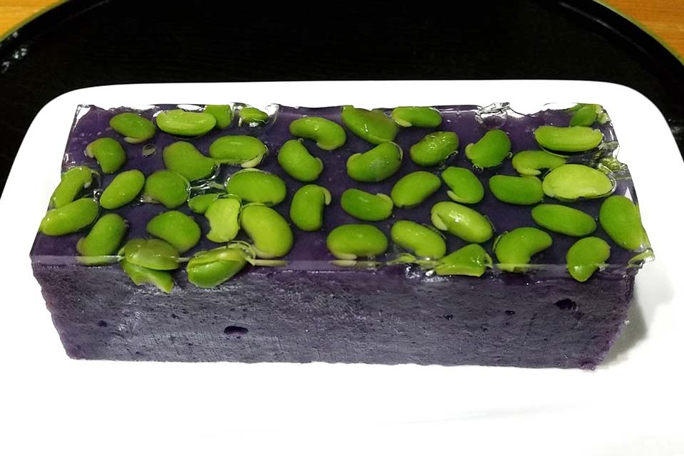 枝豆を女性や子供にも食べてもらえるようにしたかったんです。それでできたのが、コントラストが綺麗な枝豆と紫芋の羊羹なんですよ。