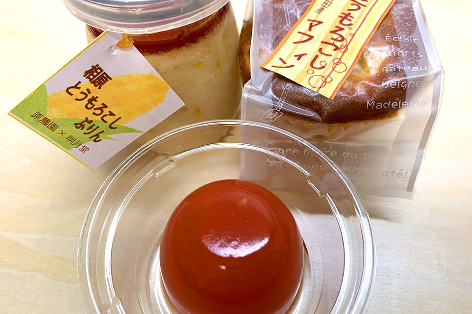 じゃじゃーん!飲み屋さんでそんな話を聞いたので早速ゲットしてきたわよ~。今年の新作のトマト寒天!あとは夏限定のとうもろこしのプリンとマフィンよ~!