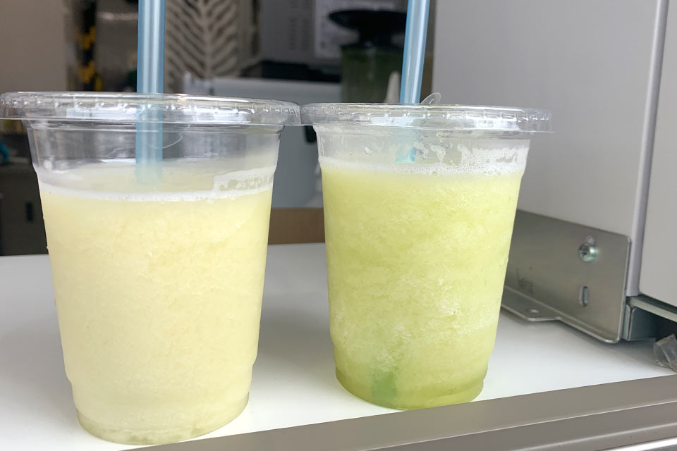 これは町田のシルクメロンのジュースと、別の場所が産地のマスクメロンのジュースです。メロンの味の違いがわかりますよ。